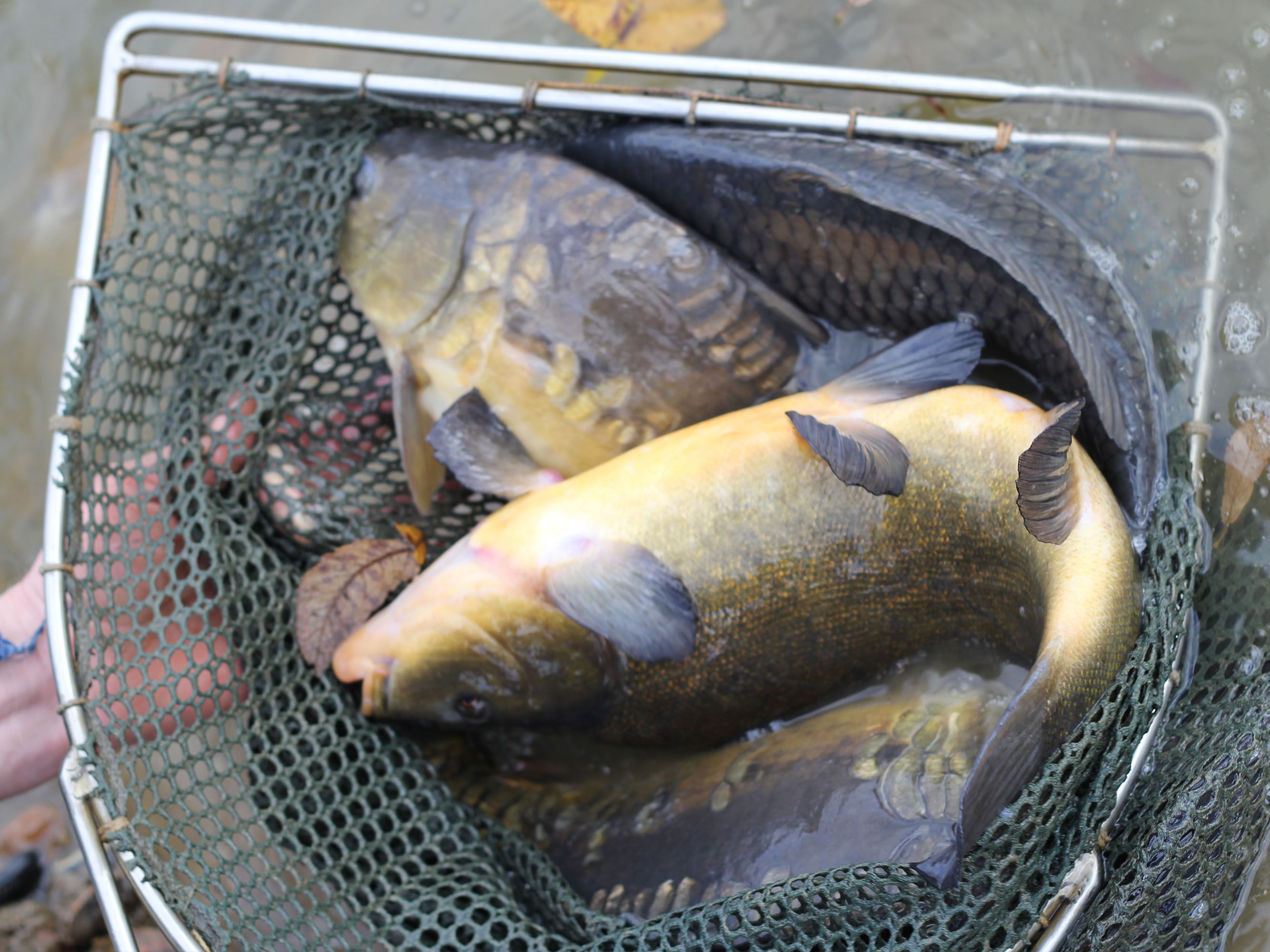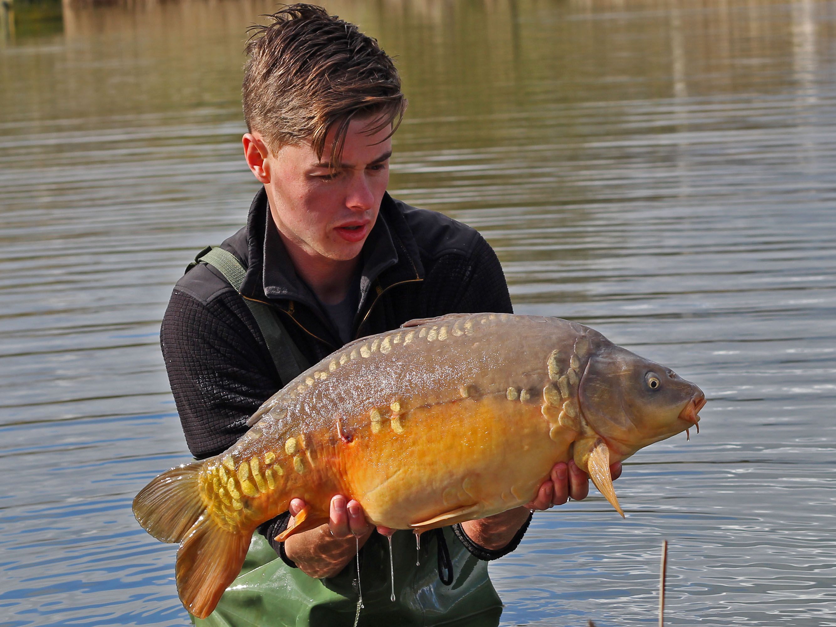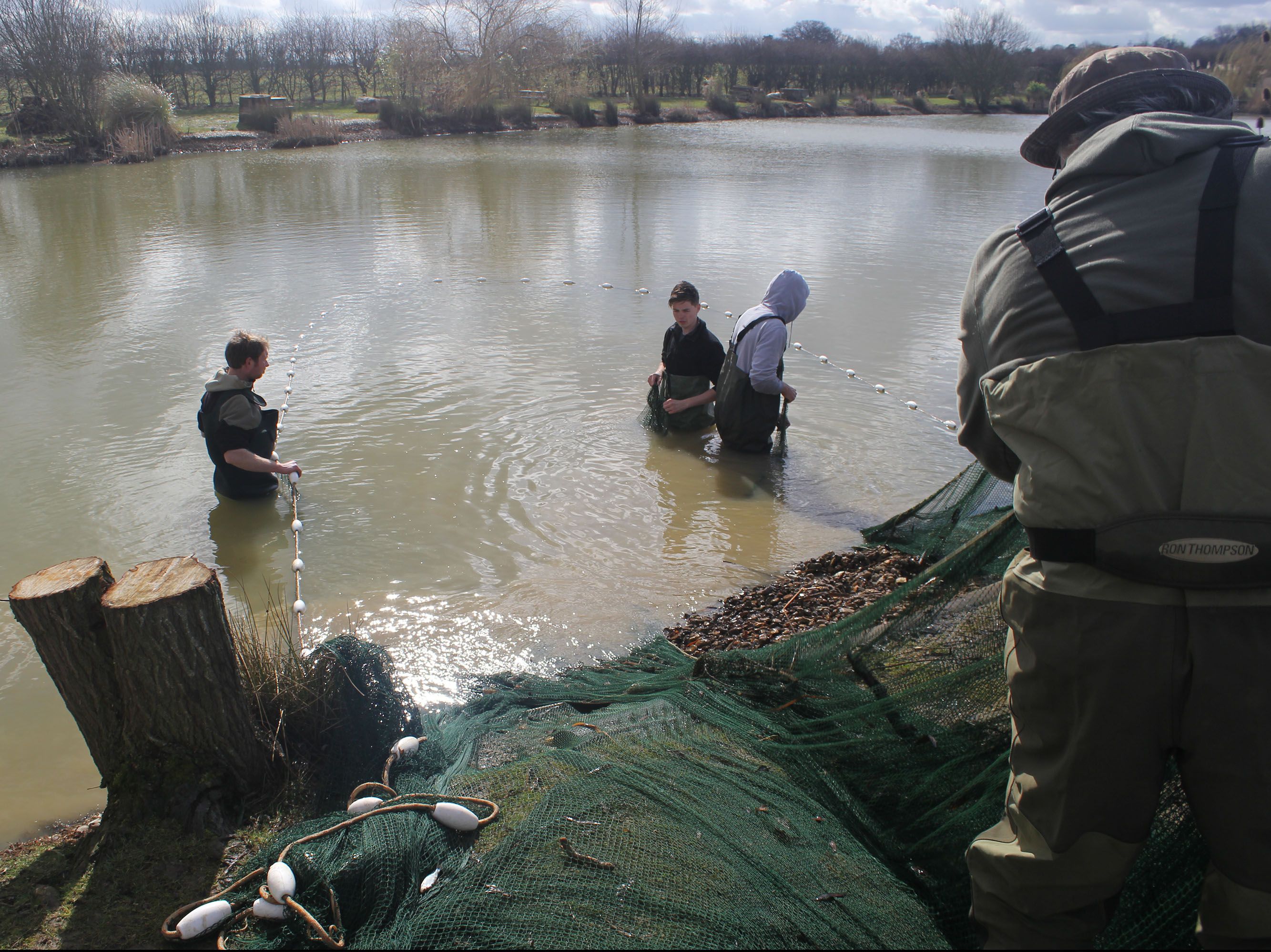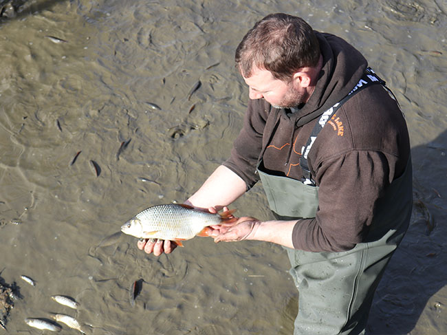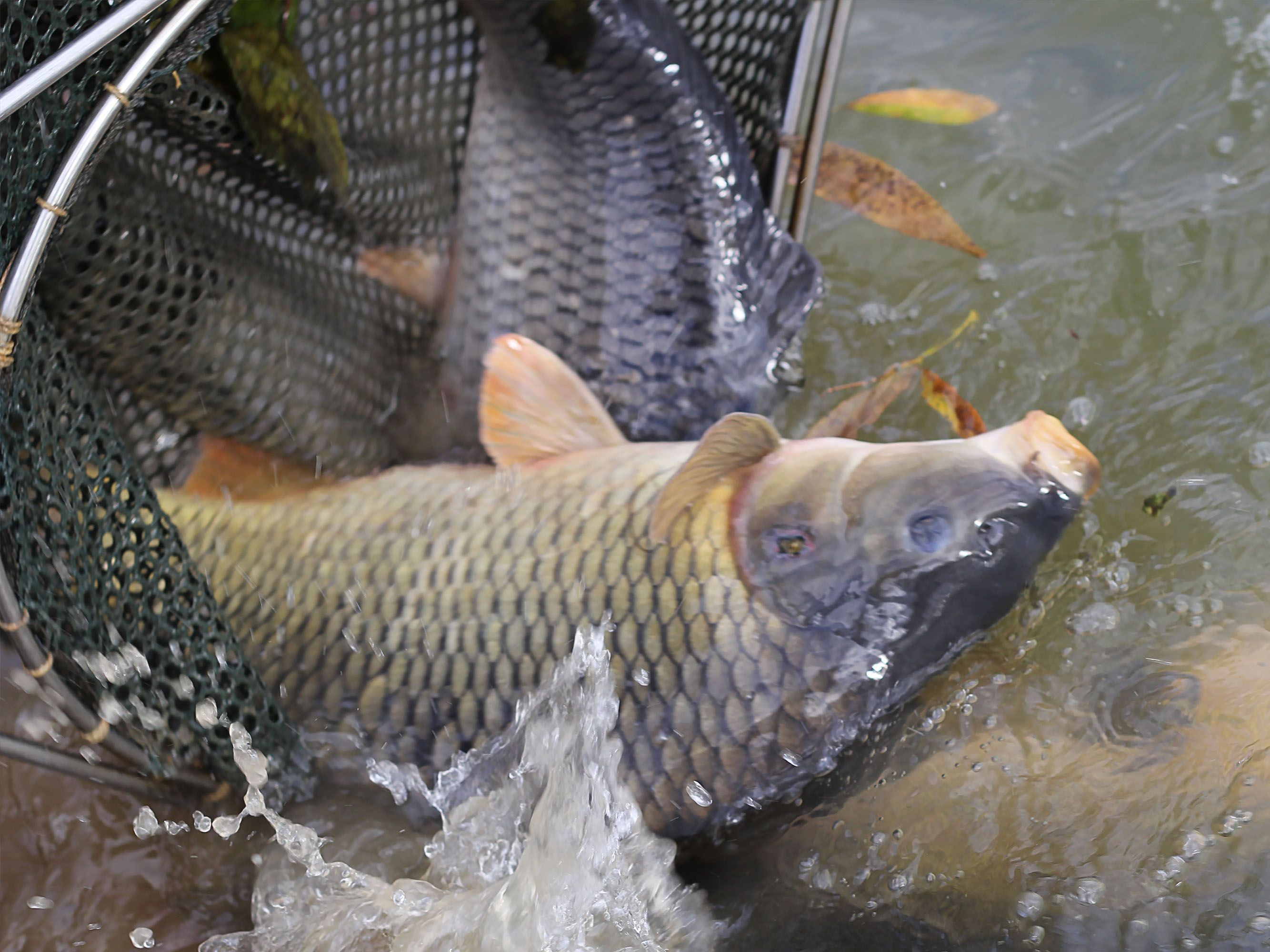 We stock 1000 C0 first summer fish into our selected ponds with no further introductions, after two years these will be drained via a monk. A normal harvest will see you record around three to five hundred fish that have survived, with anything between 1 and 8 fish being twice the size of their siblings. These very special shoot carp are transferred to specially prepared stock ponds. These ponds have been drained and herring boned (channels dug in the bottom) and limed to sterilise the area killing off any unwanted bugs etc and left to dry. The bottom is then rotavated, manured and left till the bottom grows grass to approximately 4-6 inches then flooded. The shoots are introduced to larger stock ponds which are lightly stocked yet abundant with natural foods. In these conditions our ‘genetic freaks’ thrive, packing on the weight.